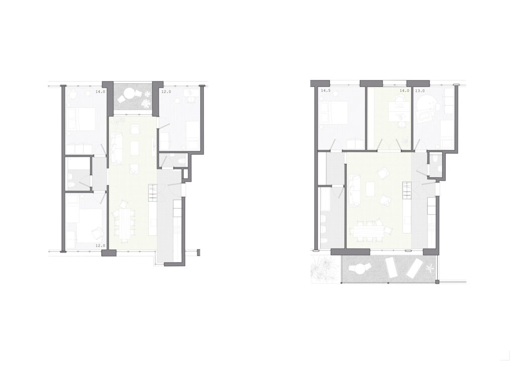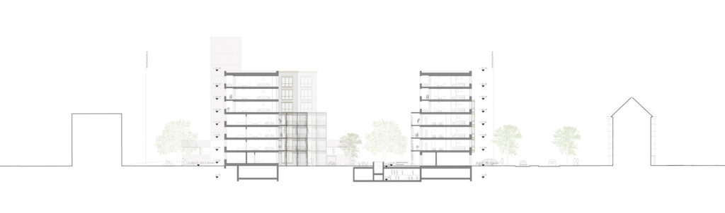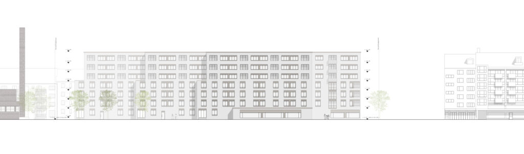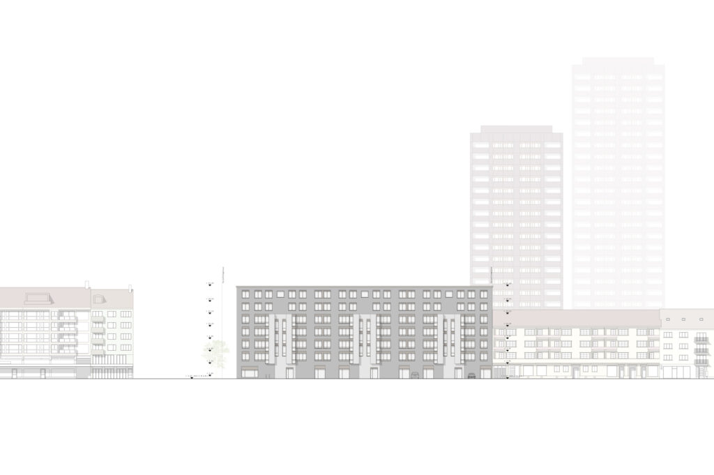 Beide Baukörper entwickeln sich über 7 Geschosse, reagieren aber jeweils unterschiedlich auf ihren Kontext: Die Zeile an der Hardstrasse reagiert auf die zulässige Regelbauweise mit fünf Geschossen: Der untere Bereich wird mit Erkern besetzt und weist ein eigenständiges Fassadenbild auf, während die beiden zusätzlichen Geschosse, die durch den Arealbonus möglich werden, als Attikageschosse in Erscheinung treten. So wird eine zukünftige Entwicklung im Sinne der Stadtverdichtung vorweggenommen und eine zonenkonforme Traufkante ausgebildet, an welche sich problemlos anknüpfen lässt. Der innere Baukörper reagiert dagegen auf die Siedlung Hardau II und bildet vier untere Geschosse aus, die mit den länglichen Zeilen in Dialog treten. Darüber werden drei Panoramageschosse erstellt: Eine Superposition von zwei unterschiedlichen Grundriss- und Fassaden-Typologien, die zu einer Einheit werden.