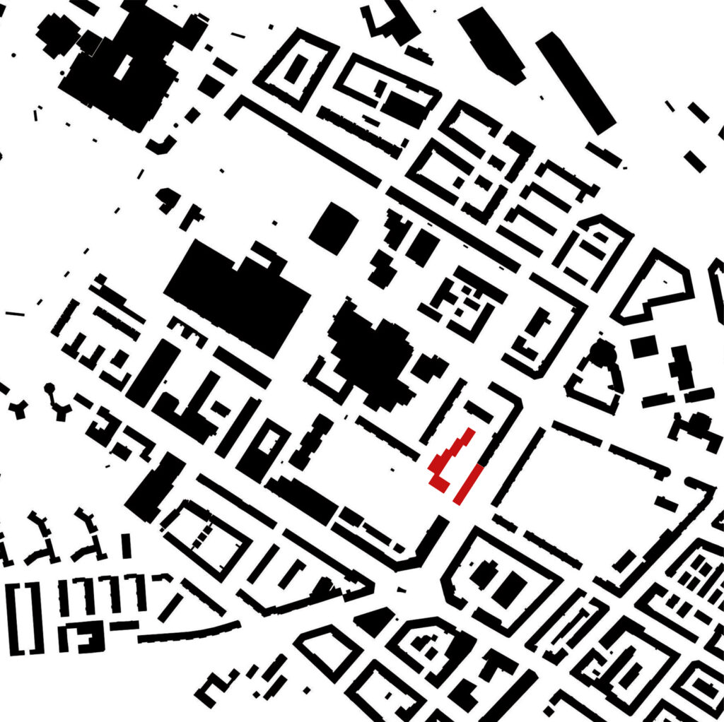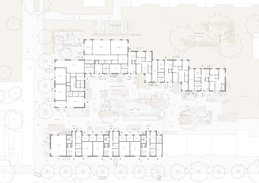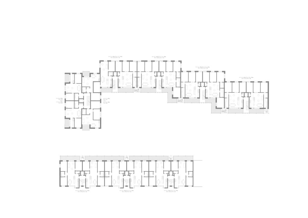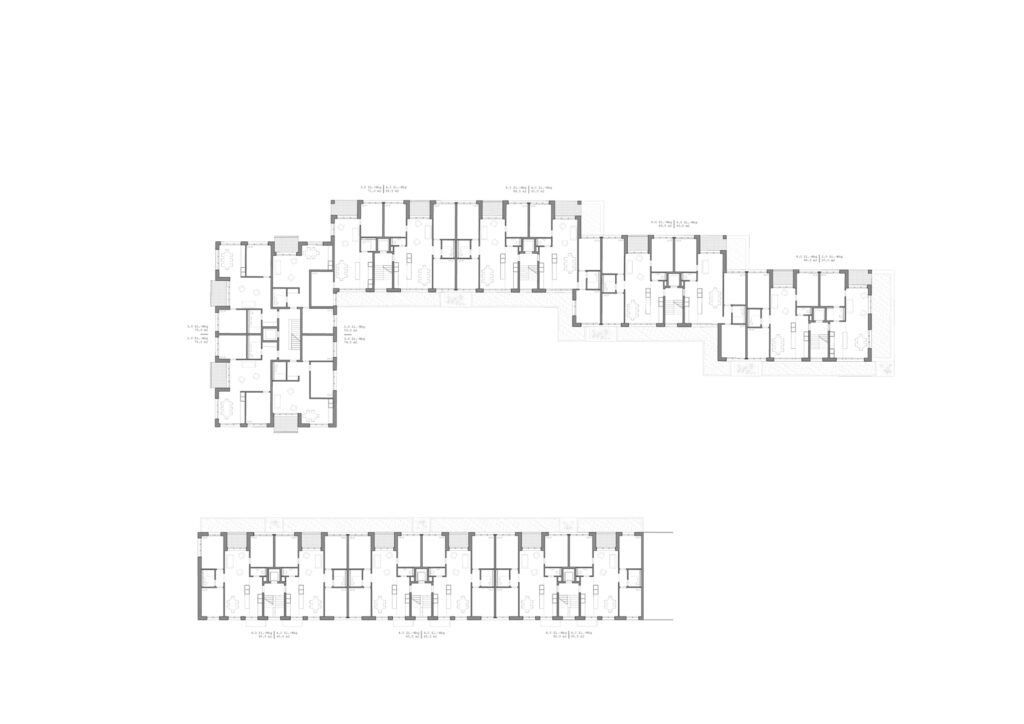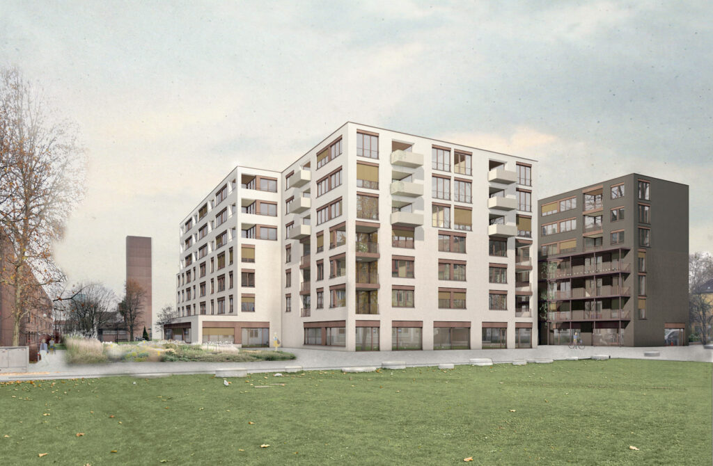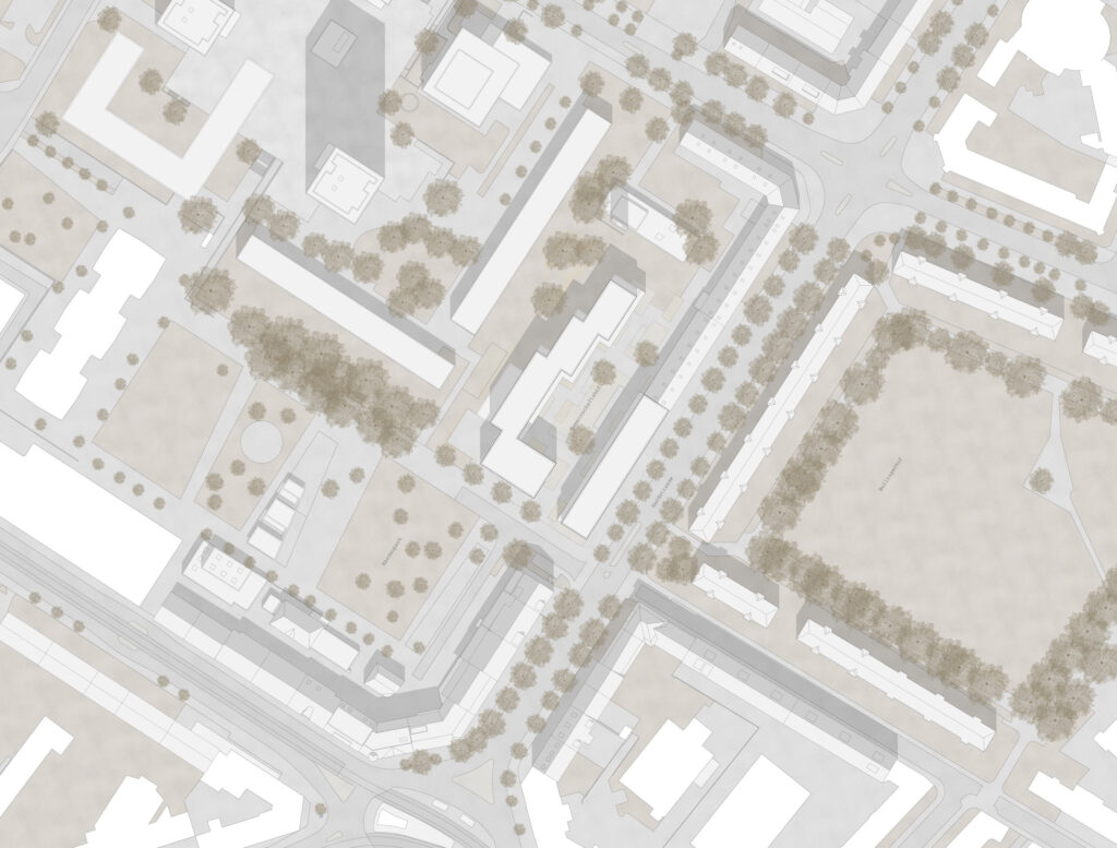 Das Grundstück liegt an der Schnittstelle zwischen zwei unterschiedlichen Stadtstrukturen: Das Dogma der Blockrandstadt trifft auf eine gebaute Stadtutopie aus den 1960er Jahren nach den Plänen von Max P. Kollbrunner. Wir schalgen zwei Baukörper vor, die in ihrer Setzung auf diese diametral unterschiedlichen Stadtstrukturen reagieren: Der Baukörper entlang der Hardstrasse ist als einfache Häuserzeile an die Baulinie gesetzt und führt die Linienführung des Blockrands fort. Den zweiten Baukörper sehen wir als Baustein im Sinne der freien Setzungen aus den 1960er Jahren im Inneren. Er besitzt wie die benachbarten Zeilen einen Zug in die Tiefe, erfährt aber eine seitliche Staffelung, welche zwei unterschiedliche Freiräume generiert, die spezifisch auf ihr Gegenüber reagieren. Zum Hardaupark hin findet die Zeile ihren Abschluss in einem Kopfbau, der den Parkraum visuell abschliesst, die räumliche Durchlässigkeit aber trotzdem bewahrt.